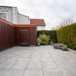 Die hochwertig gestaltete Terrasse mit Feinsteinzeugfliesen, Markise und zusätzlichem Abstellschuppen rundet das Angebot ab.